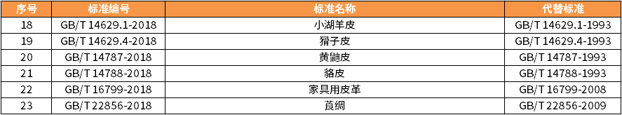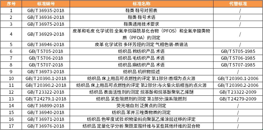 2018年12月28日,国家市场监督管理总局、国家标准化管理委员会发布2018年第17号中国国家标准公告,批准发布646项国家标准和11项国家标准修改单。其中纺织品,鞋类皮革相关的主要标准整理如下(主要涉及术语标准、方法标准和产品执行标准):
