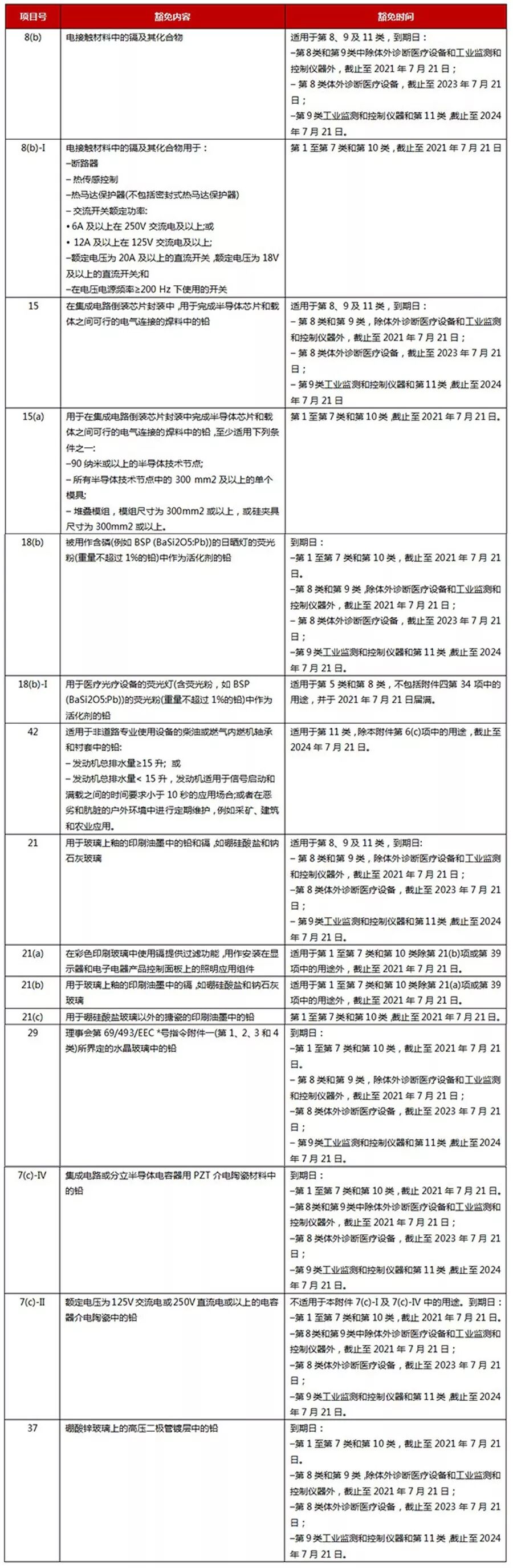 2018年11月21日,欧盟委员会发布一系列修订指令,修订2011/65/EU(RoHS指令)附件III有关铅和镉的条款。修订指令将于欧盟官方公报公布日期之后的第二十天生效。