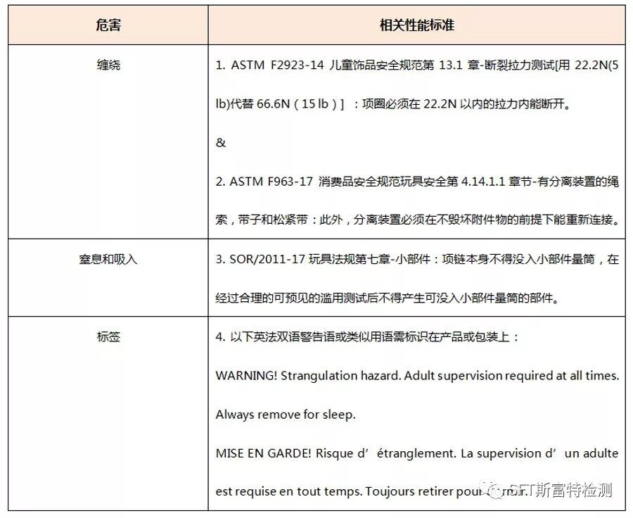 加拿大卫生部得出的结论是,未满足以下四项性能标准或其等同标准的三岁以内儿童佩戴的牙胶项链可能被视为会危害消费者健康或安全。这四项标准的详细说明见下表: