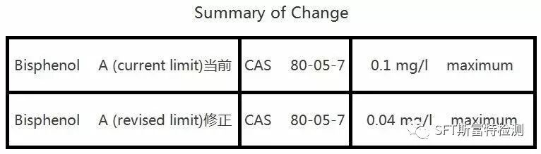 BPA是一种化学物质,被广泛使用在硬质的和透明的塑胶材料里,通常可以在食品或者饮料的容器里面发现。当使用含有BPA的容器盛装液体的时候,该化学物质很容易从塑胶中分离出来进入到液体中去,特别是装热水的时候。测试方法将按照欧洲标准EN 71-10:2005和EN 71-11:2005。根据该提案,2009/48/EC指令附件II第III部分第13点前后对比如下: