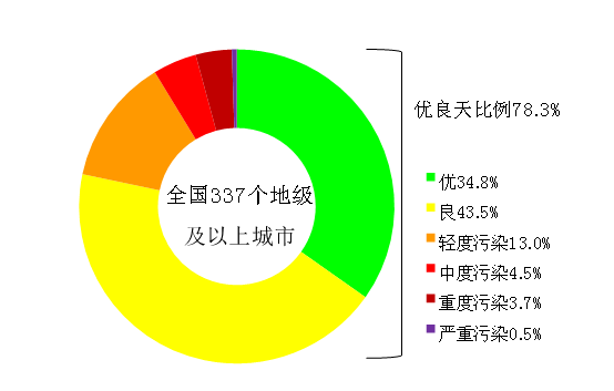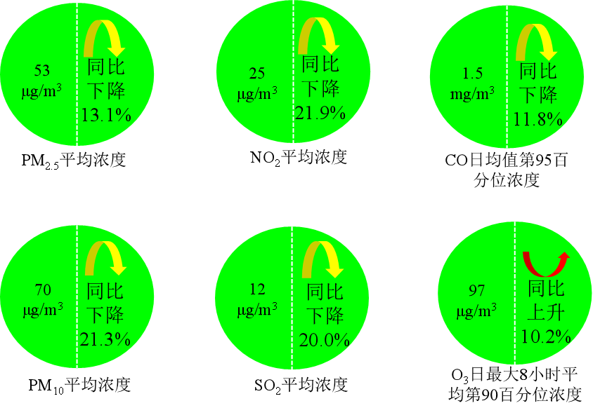 1-2月,全国337个地级及以上城市平均优良天数比例为78.3%,同比上升7.4个百分点;111个城市环境空气质量达标,同比增加28个;PM2.5浓度为53微克/立方米,同比下降13.1%;PM10浓度为70微克/立方米,同比下降21.3%;O3浓度为97微克/立方米,同比上升10.2%;SO2浓度为12微克/立方米,同比下降20.0%;NO2浓度为25微克/立方米,同比下降21.9%;CO浓度为1.5毫克/立方米,同比下降11.8%。