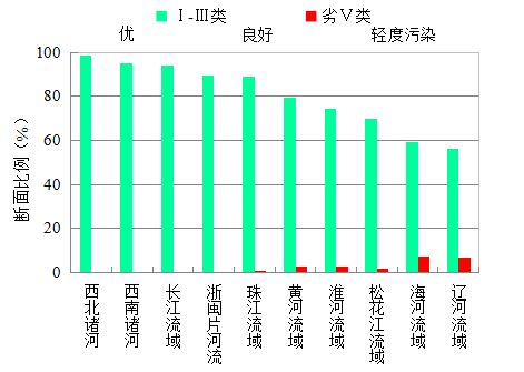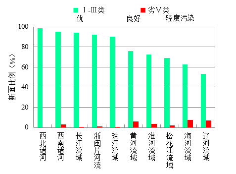 1-2月,长江、黄河、珠江、松花江、淮河、海河、辽河等七大流域及西北诸河、西南诸河和浙闽片河流Ⅰ-Ⅲ类水质断面比例为82.4%,同比上升5.3个百分点;劣Ⅴ类为2.5%,同比下降5.0个百分点。主要污染指标为化学需氧量、氨氮和高锰酸盐指数。其中,西北诸河、西南诸河、长江流域、浙闽片河流和珠江流域水质为优,黄河流域水质良好,淮河、松花江、海河和辽河流域为轻度污染。