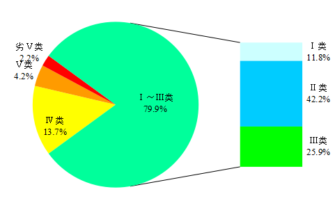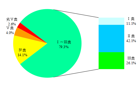 1-2月,1940个国家地表水考核断面中(实测1934个),水质优良(Ⅰ-Ⅲ类)断面比例为79.3%,同比上升4.6个百分点;劣Ⅴ类断面比例为2.6%,同比下降4.3个百分点。主要污染指标为化学需氧量、总磷和氨氮。
