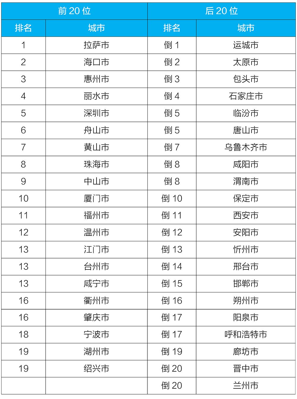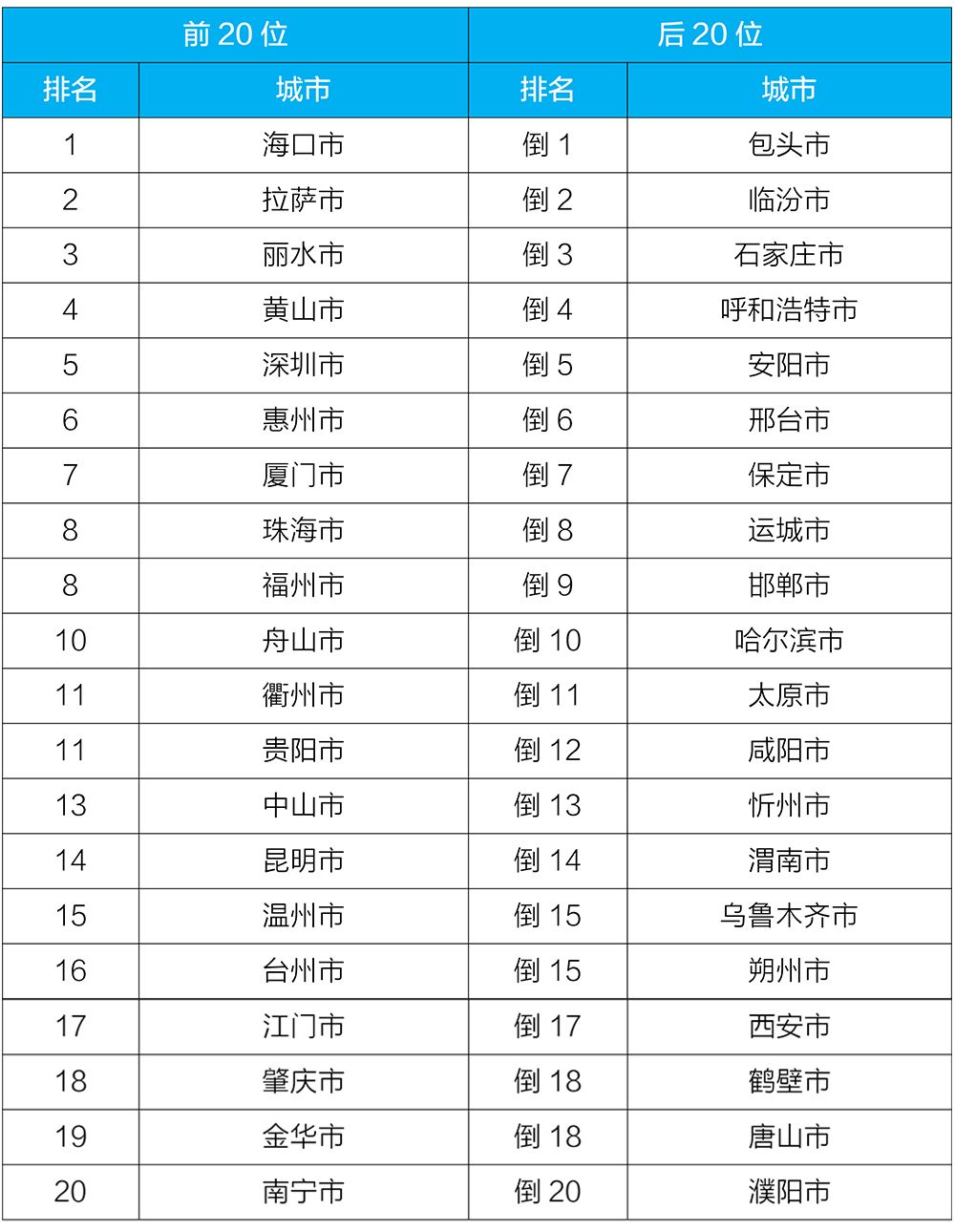 1-2月,168个重点城市中包头、临汾、石家庄市等城市空气质量相对较差(从倒数第1名至倒数第20名);海口、拉萨、丽水市等城市空气质量相对较好(从第1名至第20名,见附表6)。