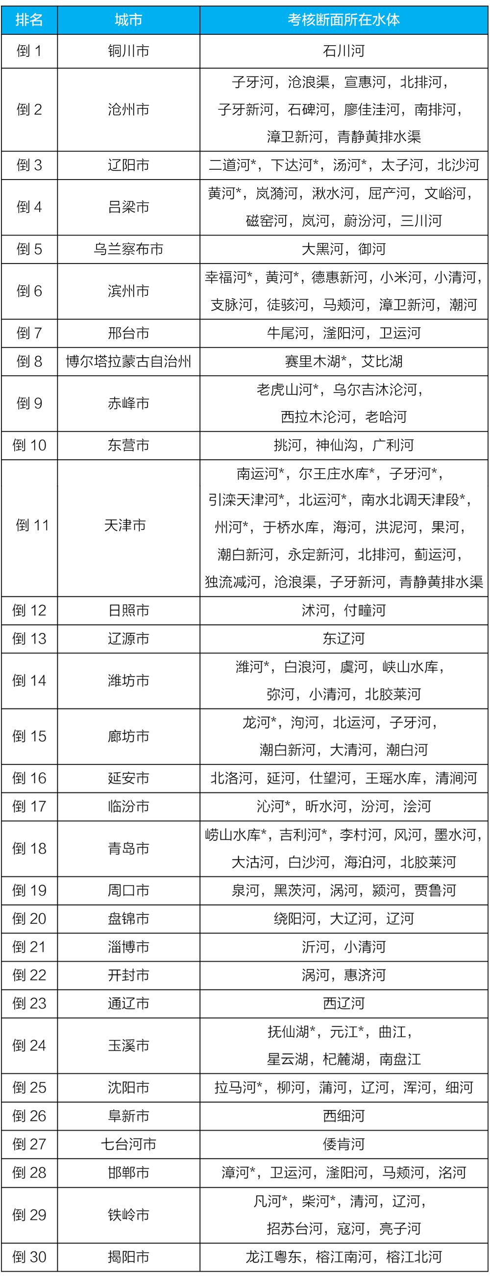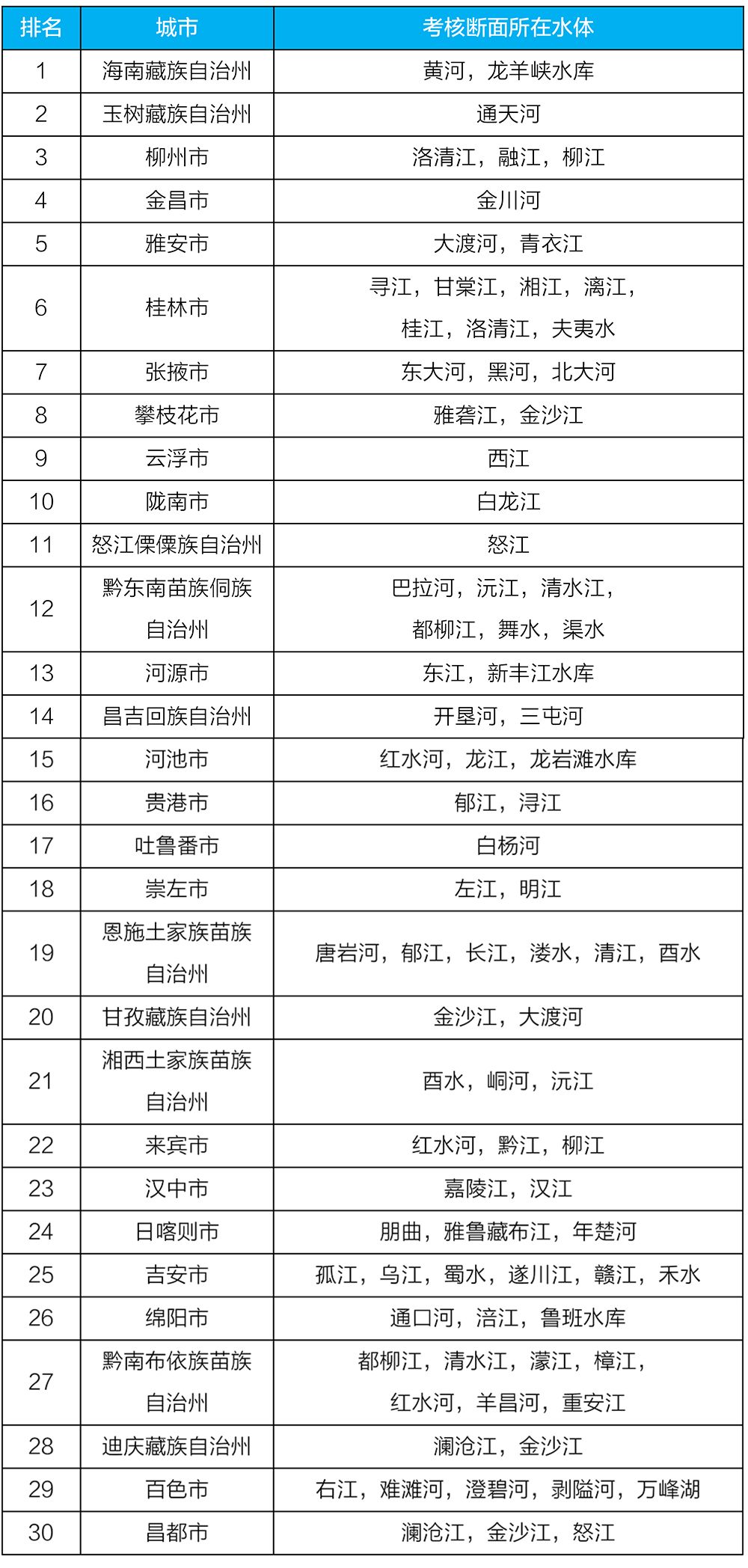 参加排名的全国地级及以上城市,覆盖2050个国控断面(其中1940个为国家地表水考核断面,110个为入海控制断面)。2月,全国地级及以上城市中,玉树、海南、金昌等30个城市国家地表水考核断面水环境质量相对较好(从第1名到第30名),铜川、沧州、辽阳等30个城市国家地表水考核断面水环境质量相对较差(从倒数第1名到倒数第30名)。详见附表1、附表2。